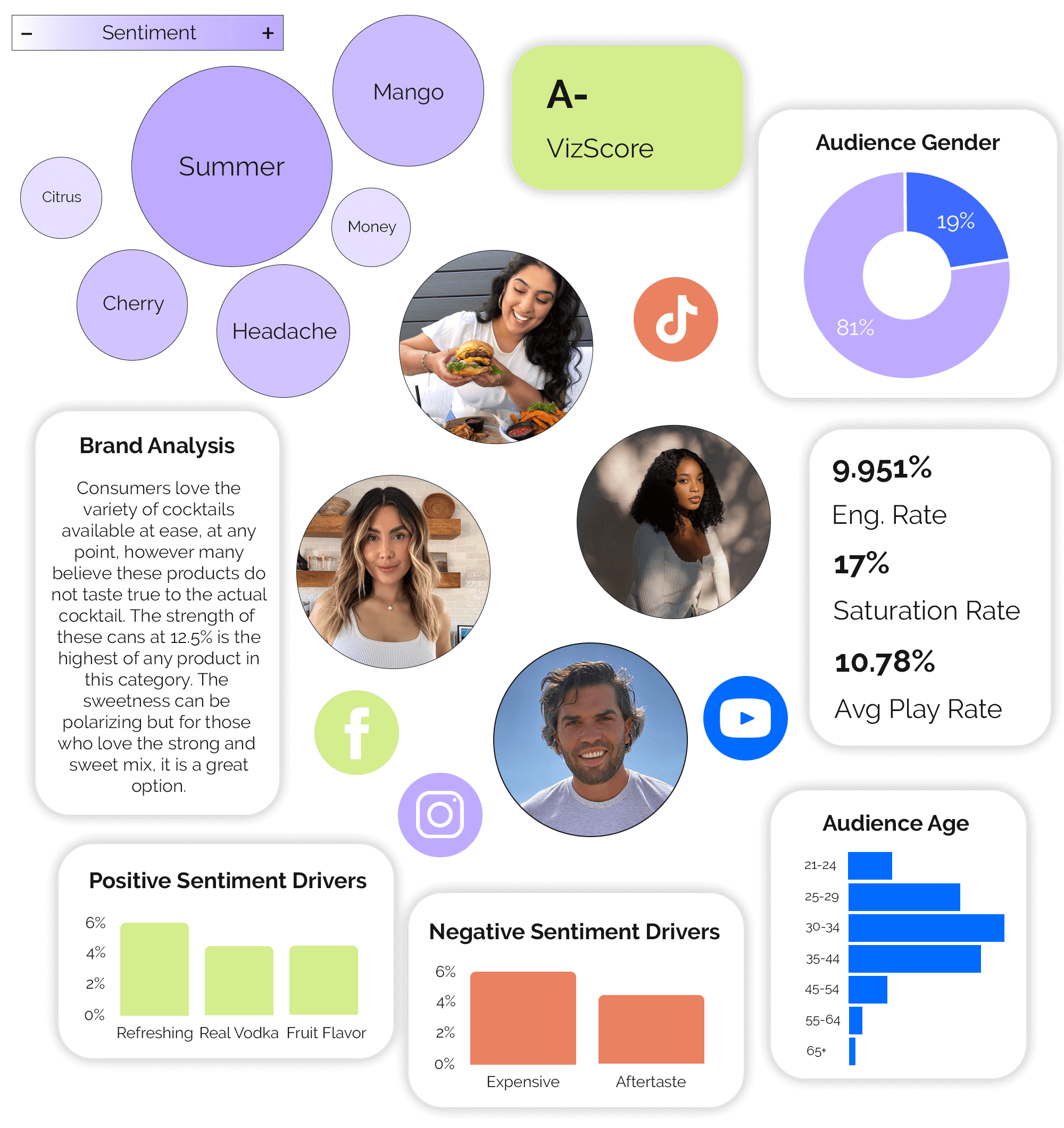 Our advanced VizSense Platform utilizes a sophisticated algorithm to analyze influencer content performance and audience data. Evaluating influencers' metrics against those with similar followings generates an abundance of data, including a Viz Score. Using creators thoroughly vetted through our technology and our team ensures your campaigns are optimized to maximize ROI and achieve lasting impact.
